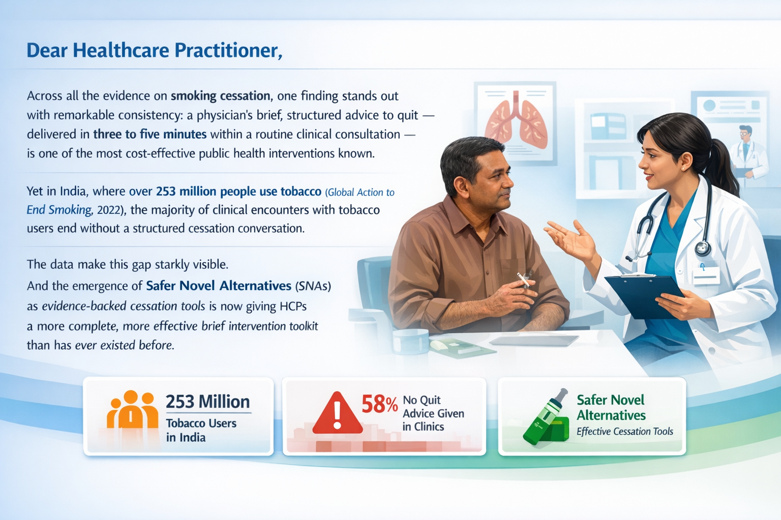 The HCP's hesitation to initiate a cessation conversation has historically been, in part, rooted in a perceived lack of practical tools to offer patients who express readiness to quit but face barriers to clinic-based pharmacotherapy. Safer Novel Alternatives — including nicotine e-cigarettes and other SNA formulations — are now shifting that calculus by providing cessation-motivated smokers with options that fit their daily realities.